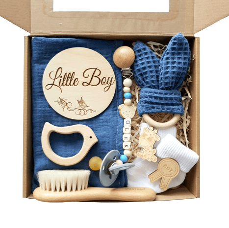 4. Baby Shower Gift Box - Muślinowa Pieluszka i Drewniany Gryzak w Eko Pudełku