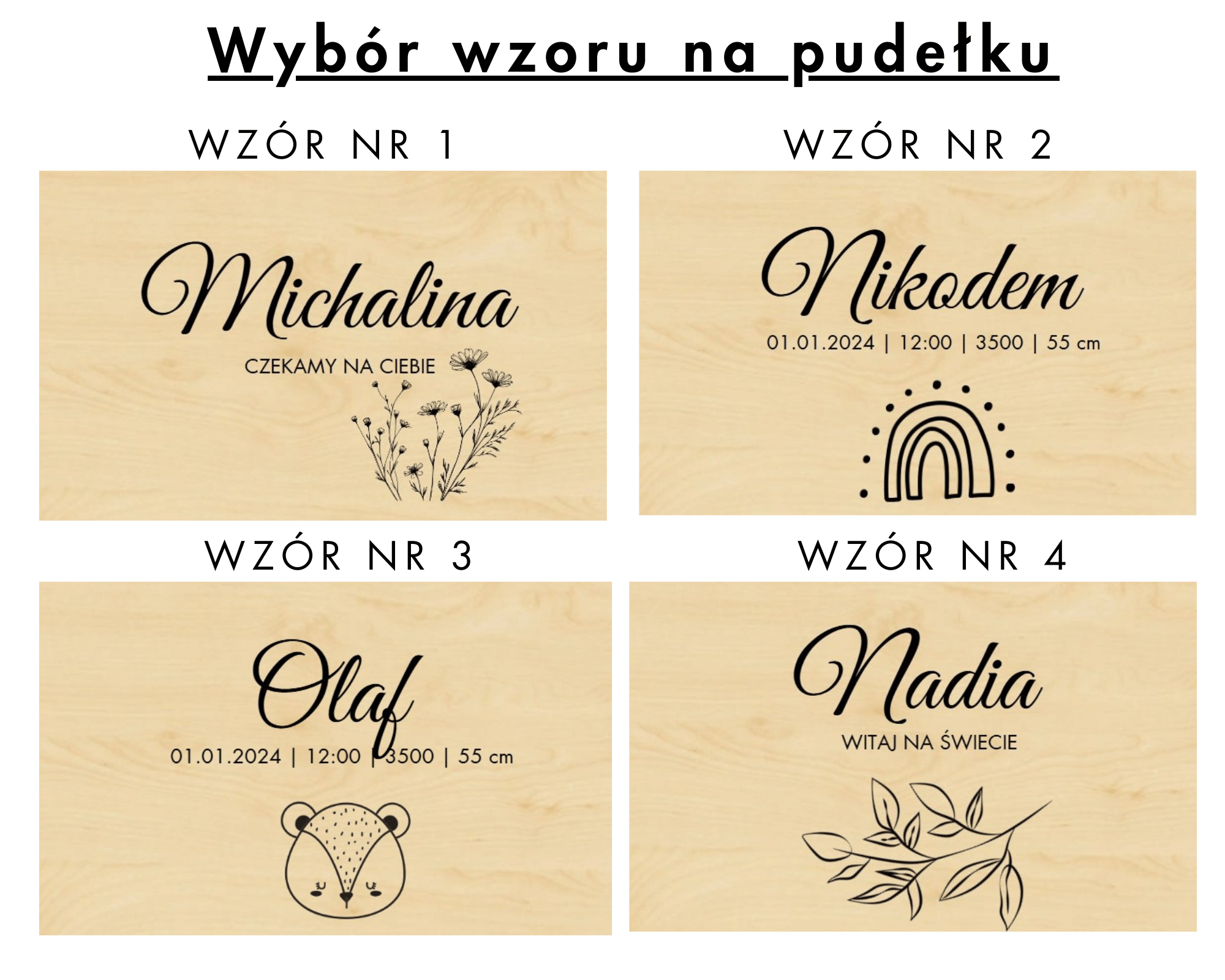 Całość jest zapakowana w eleganckie drewniane pudełko z grawerem, którego wzór można wybrać. Dzięki temu zestaw prezentowy jest gotowy do wręczenia i będzie piękną pamiątką na lata.