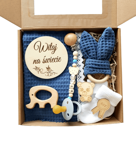 Personalizowany Gift Box na Narodziny Dziecka - Zawieszka do Smoczka i Gryzak