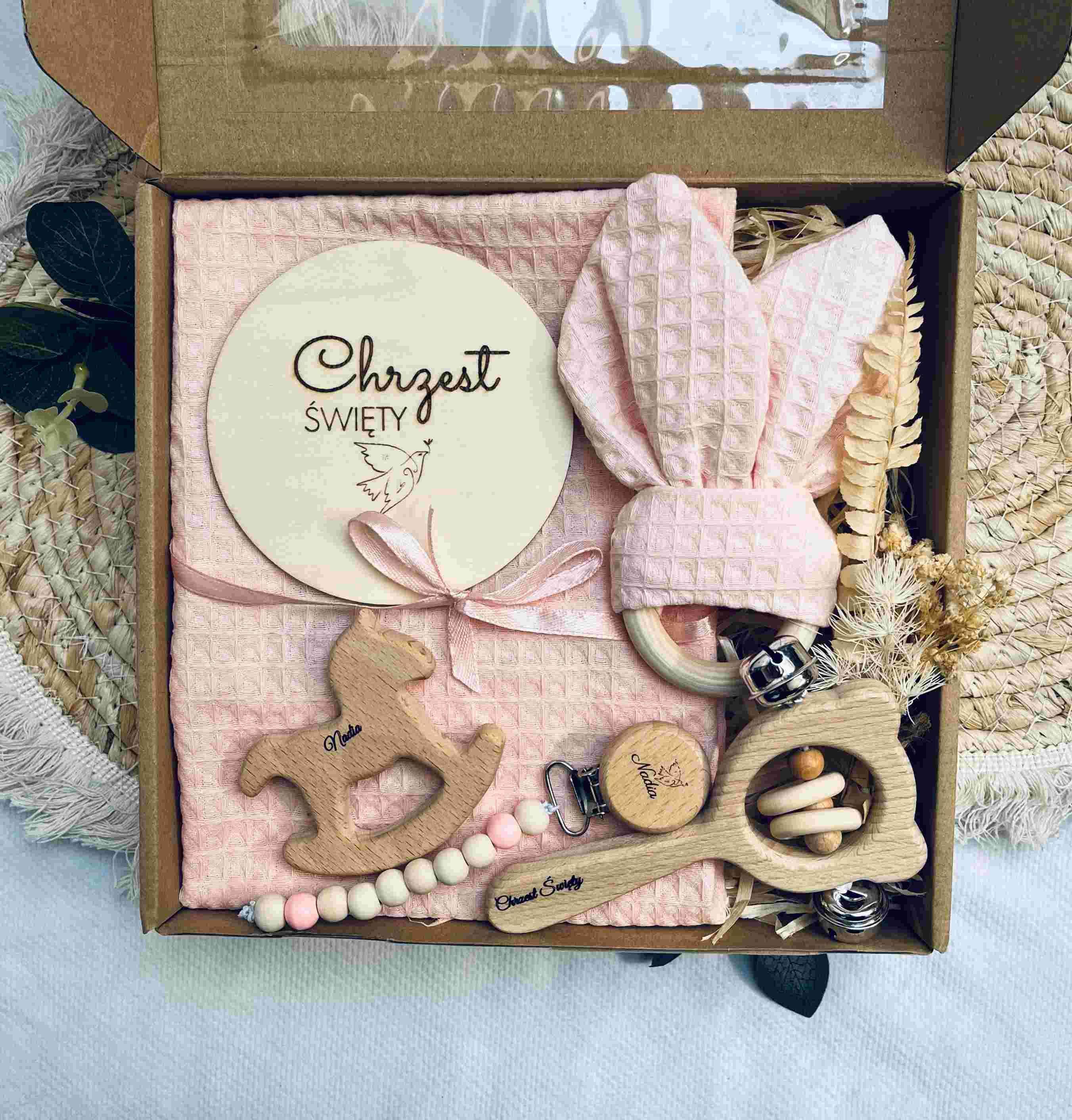Szukasz ponadczasowego, pięknego i praktycznego prezentu na Chrzest Święty? Ten ręcznie wykonany zestaw będzie wyjątkową pamiątką tego ważnego dnia – idealny zarówno dla dziewczynki, jak i chłopca. Stworzony z bezpiecznych, certyfikowanych materiałów, z dodatkiem personalizacji, która nadaje mu unikalnego charakteru.