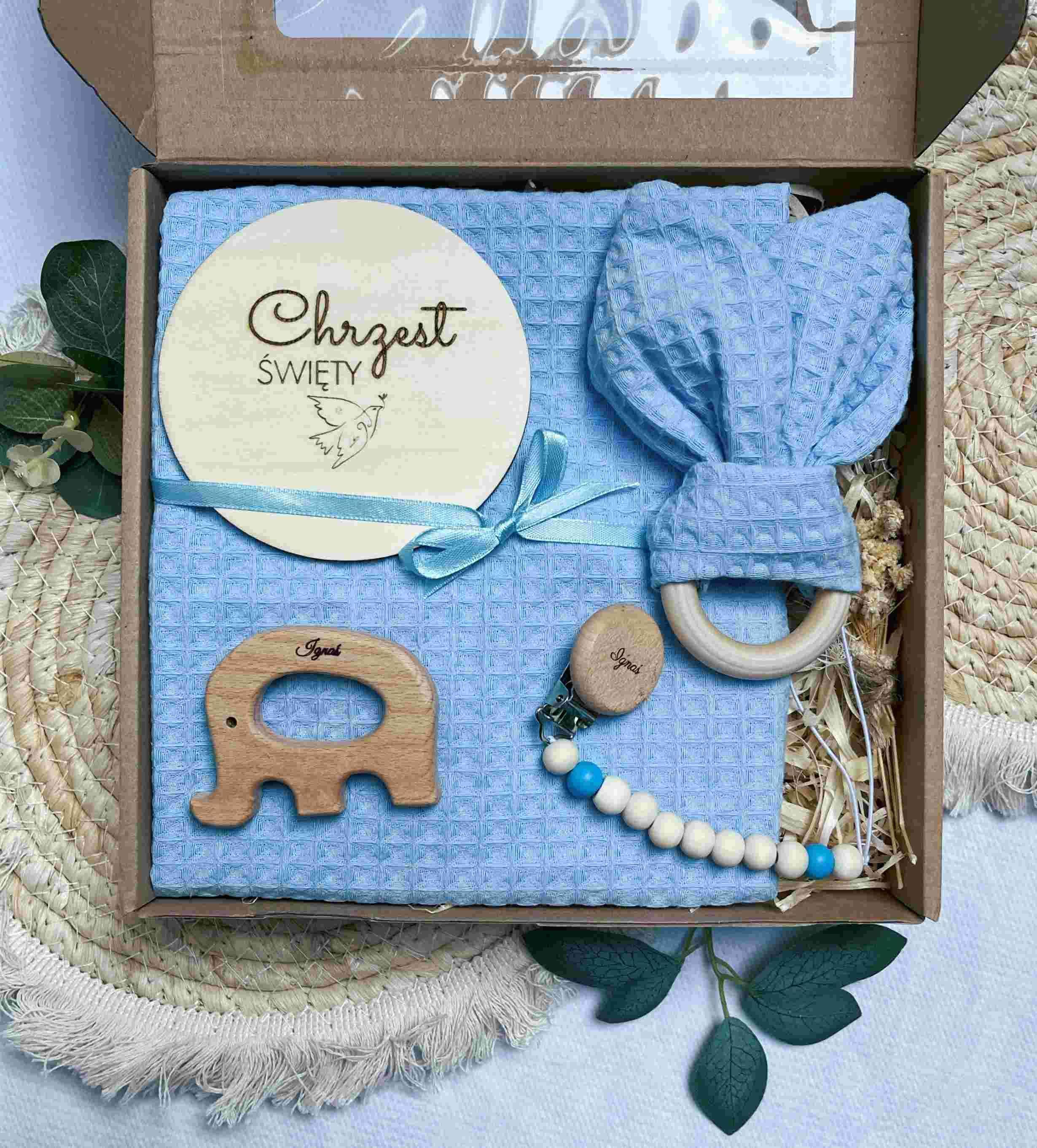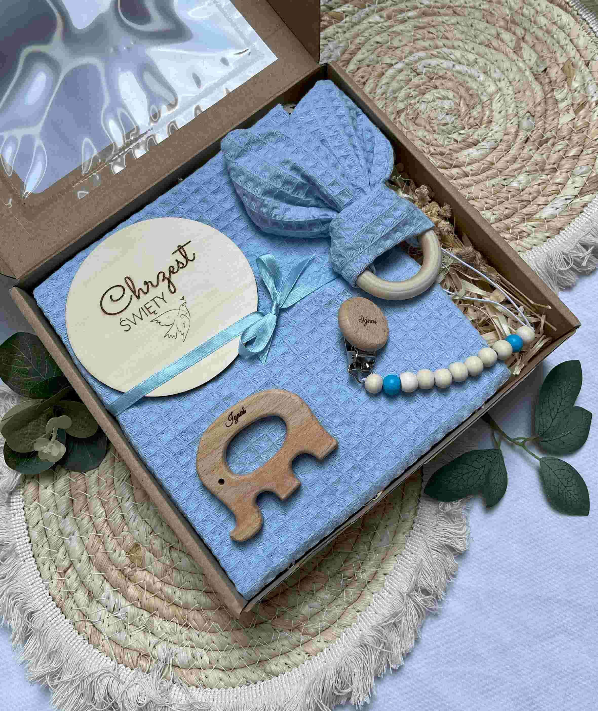 Szukasz wyjątkowego prezentu na Chrzest Święty dla chłopca? Nasz elegancki i starannie wykonany zestaw to połączenie uroku, funkcjonalności i personalizacji. Każdy element został stworzony z myślą o bezpieczeństwie i komforcie maluszka, a także o tym, by pozostać piękną pamiątką na długie lata. Idealny wybór na prezent od chrzestnych, dziadków lub bliskich!