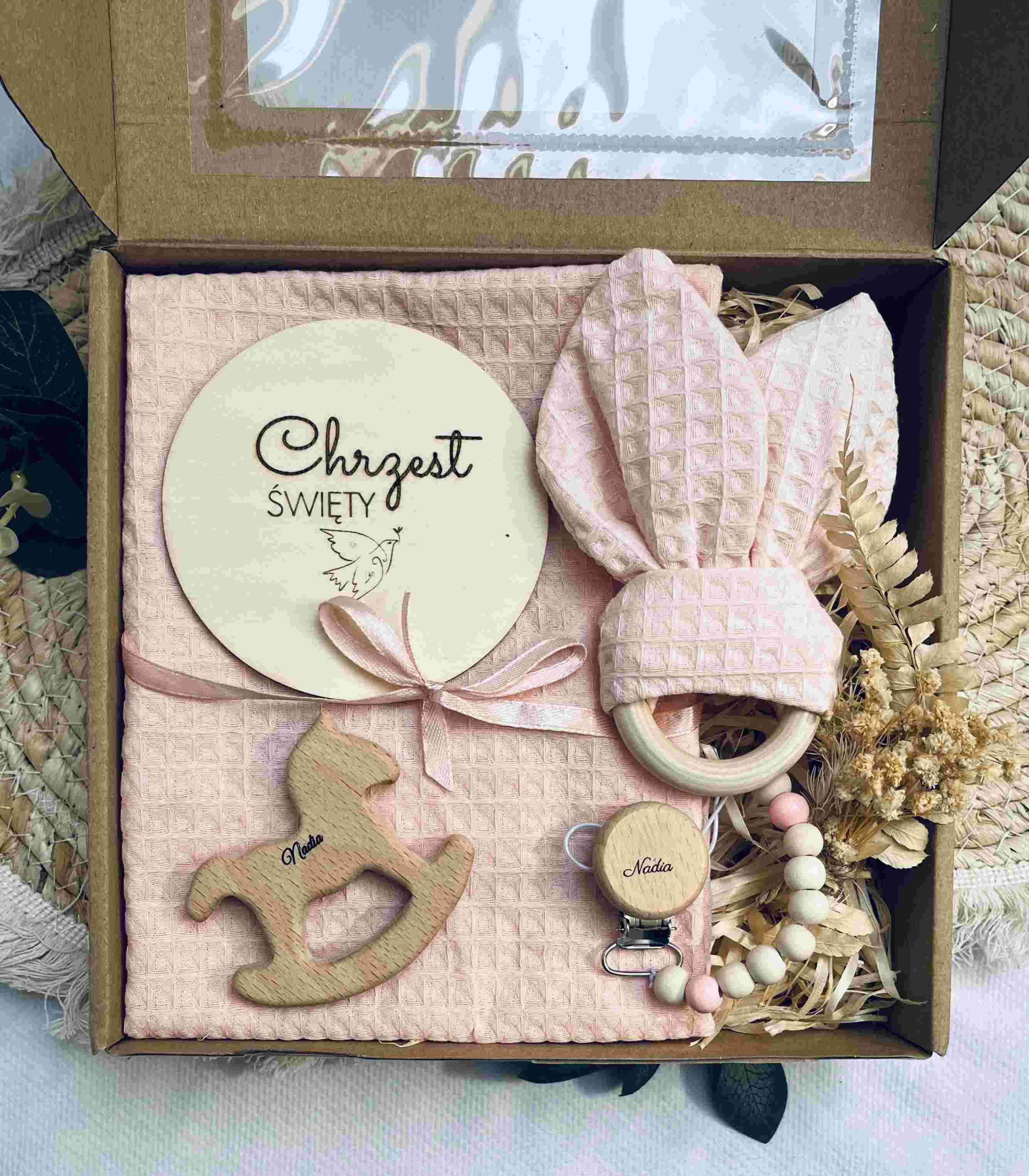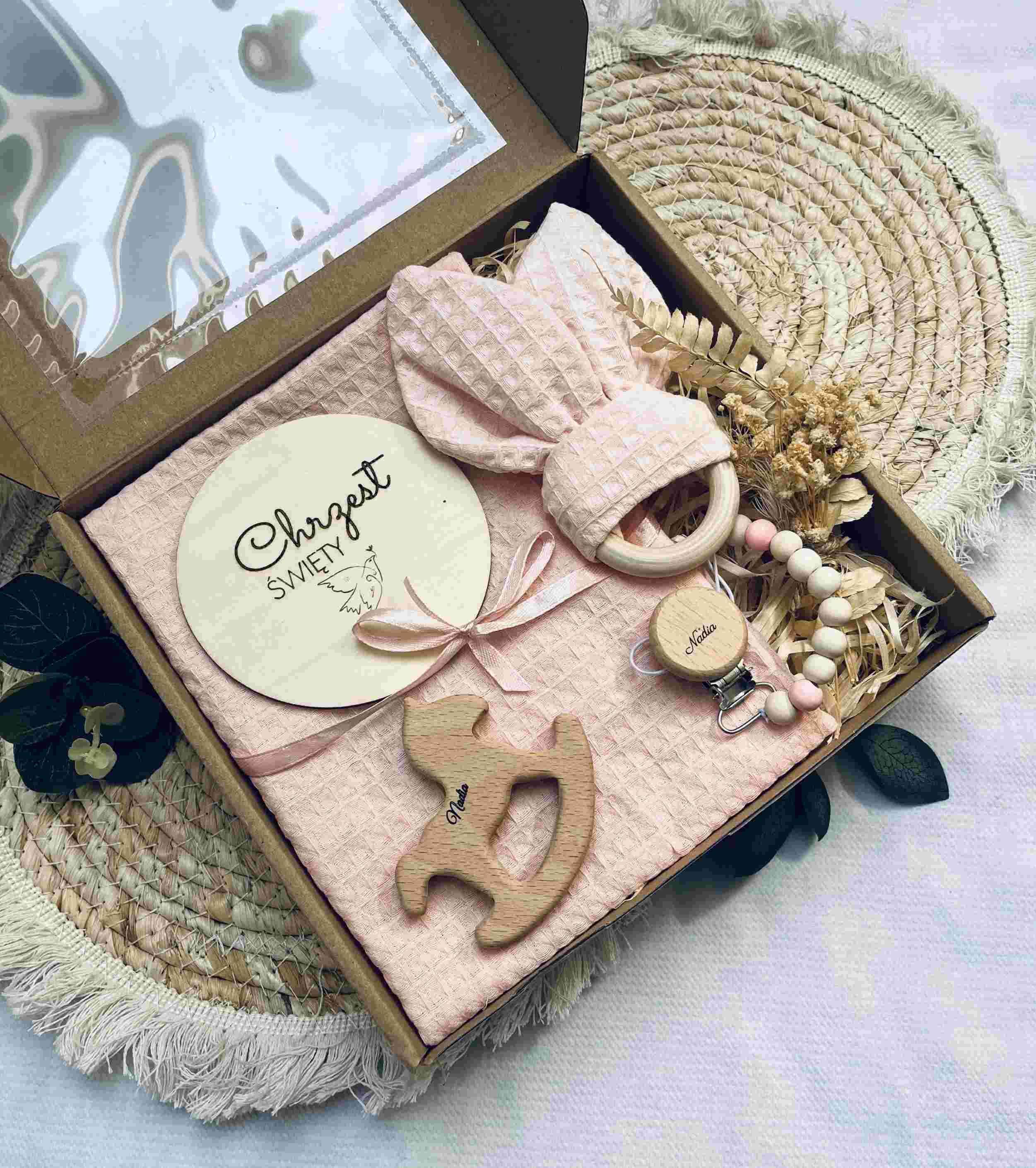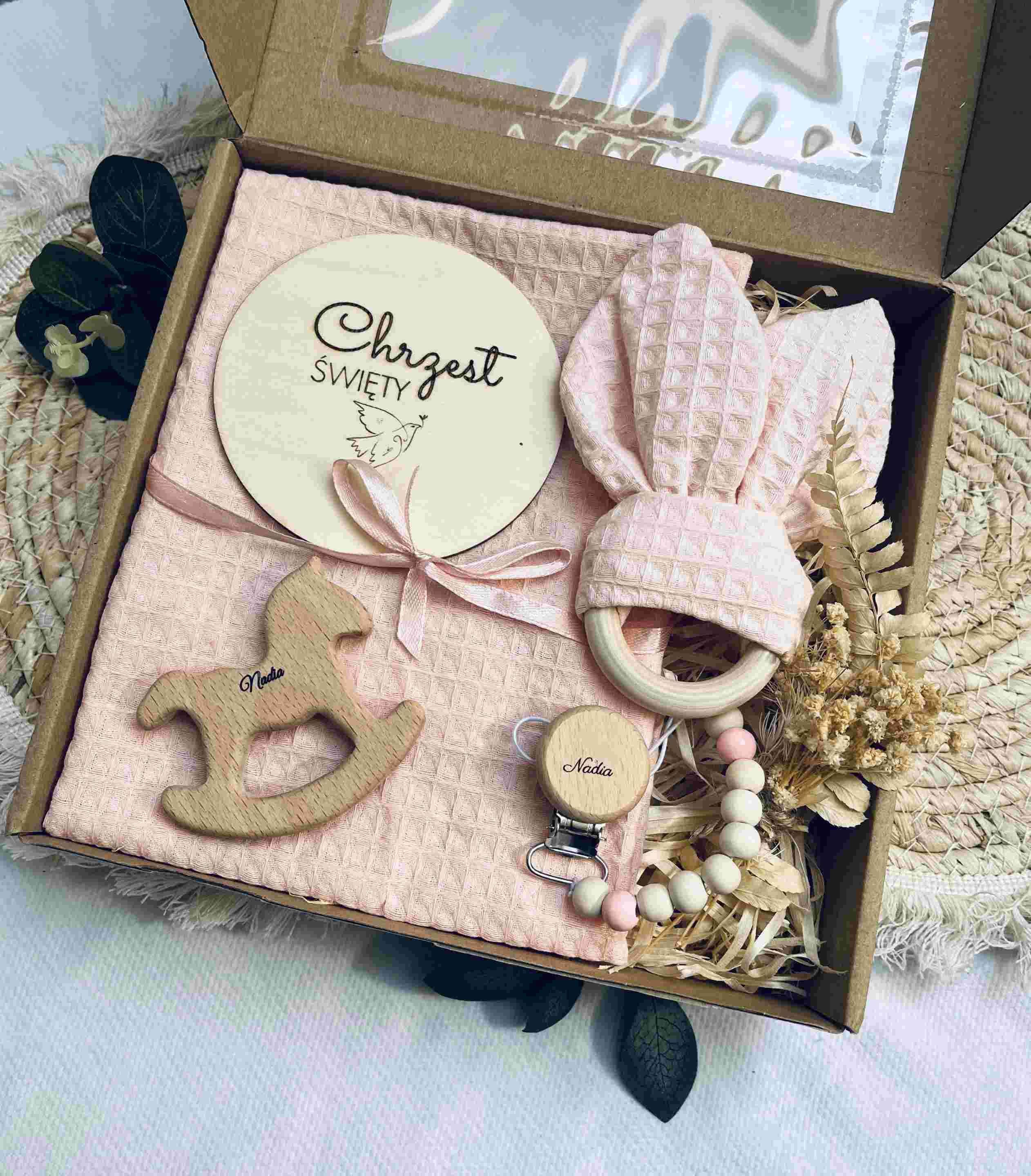 Szukasz wyjątkowego prezentu na Chrzest Święty dla dziewczynki? Nasz uroczy i starannie skomponowany zestaw to idealne połączenie piękna, funkcjonalności i sentymentu. Każdy element wykonany jest z bezpiecznych, naturalnych materiałów i z myślą o wyjątkowym dniu, jakim jest chrzest. Doskonały wybór na prezent od chrzestnych, dziadków lub przyjaciół rodziny.