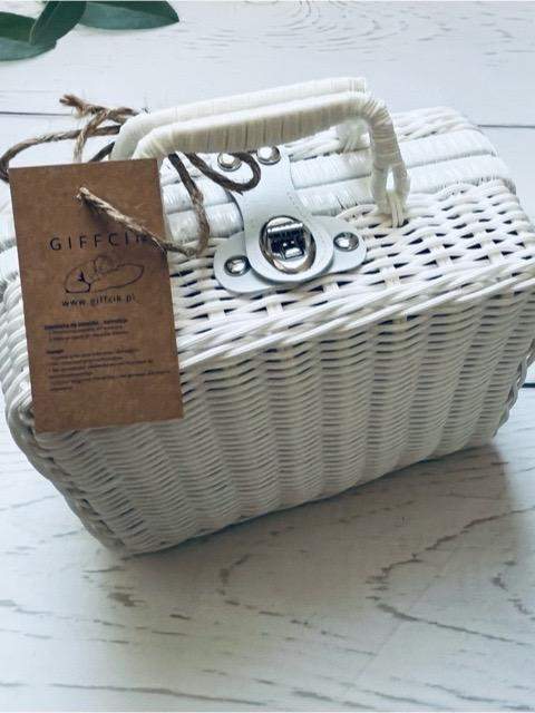Całość estetycznie zapakowana w elegancki biały koszyczek w formie walizki, gotowy do wręczenia